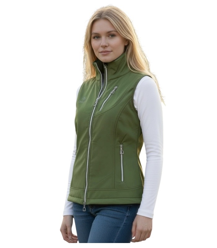 Stylish Olive Green Gilet, extremely comfortable, perfect for riding, has a two way zip, 2 large pockets and a smaller pocket on the left chest, adjustable toggles on collar and the waist. Perfect for wearing with a base layer or T-shirt.